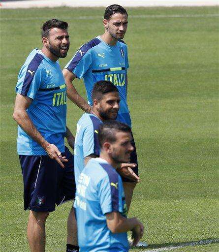 From top, Italy players Mattia De Sciglio, Andrea Barzagli, Lorenzo Insigne and Alessandro Florenzi attend a training session at the Bernard Gasset center in Montpellier, France, Wednesday, June 29, 2016. Italy will face Germany in a Euro 2016 quarter final soccer match in Bordeaux on Saturday, July 2, 2016. (AP Photo/Antonio Calanni) The Associated Press