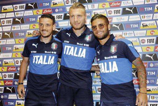 Italy's Ciro Immobile, center, Italy's Alessandro Florenzi, left, and Italy's Lorenzo Insigne pose for photographers prior to the start of a press conference at the "Casa Azzurri" in Montpellier, France, Wednesday, June 29, 2016. Italy will face Germany in a Euro 2016 quarter final soccer match in Bordeaux on Saturday, July 2, 2016. (AP Photo/Antonio Calanni) The Associated Press