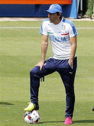 Italy coach Antonio Conte attends a training session at the Bernard Gasset center in Montpellier, France, Wednesday, June 29, 2016. Italy will face Germany in a Euro 2016 quarter final soccer match in Bordeaux on Saturday, July 2, 2016. (AP Photo/Antonio Calanni) The Associated Press