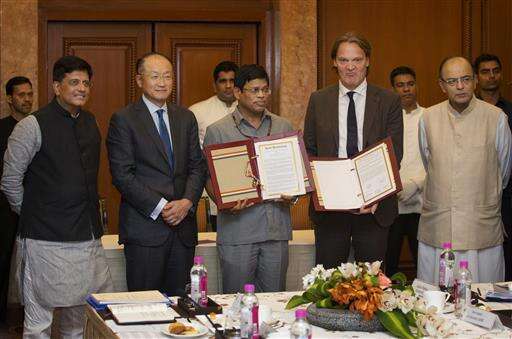 From left, Indian Power and Renewable Energy Minister Piyush Goyal, World Bank President Jim Yong Kim, Secretary of Indian Ministry of New and Renewable Energy Upendra Tripathy, World bank India director Onno Ruhl and Indian Finance minister Arun Jaitley, pose for the media after signing a deal to boost solar energy globally, in New Delhi, India, Thursday, June 30, 2016. The World Bank Group Thursday signed an agreement with the International Solar Alliance, consisting of 121 countries led by India, to collaborate on increasing solar energy use around the world, with the goal of mobilizing $1 trillion in investment by 2030. (AP Photo/Manish Swarup)