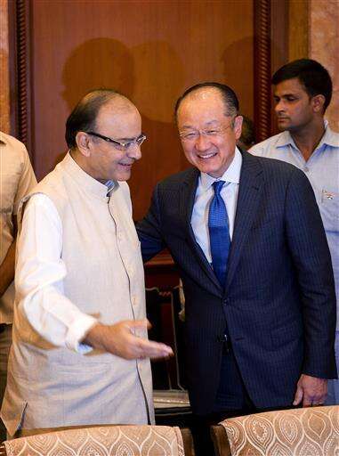 Indian Finance Minister Arun Jaitley, left, meets with World Bank President Jim Yong Kim, in New Delhi, India, Thursday, June 30, 2016. The World Bank Group Thursday signed an agreement with the International Solar Alliance, consisting of 121 countries led by India, to collaborate on increasing solar energy use around the world, with the goal of mobilizing $1 trillion in investment by 2030. (AP Photo/Manish Swarup)