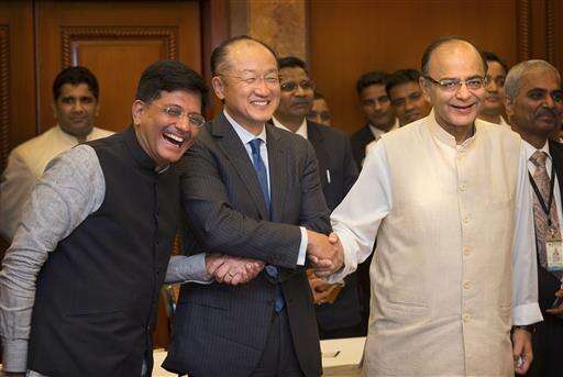 World Bank President Jim Yong Kim, center, shakes hand with Indian Finance Minister Arun Jaitley, right, and Indian Power and Renewable Energy Minister Piyush Goyal after signing a deal to boost solar energy globally, in New Delhi, India, Thursday, June 30, 2016. The World Bank Group Thursday signed an agreement with the International Solar Alliance, consisting of 121 countries led by India, to collaborate on increasing solar energy use around the world, with the goal of mobilizing $1 trillion in investment by 2030. (AP Photo/Manish Swarup)
