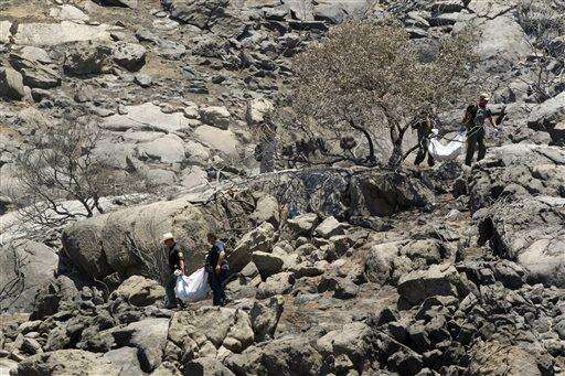 San Diego County Sheriff's Deputies carry the remains of two victims of the Potrero, Calif., wildfire down from a hillside Wednesday, June 29, 2016. San Diego County Sheriff's Department spokeswoman Jan Caldwell said the unidentified man and woman were found Wednesday near a boulder in Potrero, about 45 miles east of San Diego. The property had been under mandatory evacuation orders after a fire began on June 19 and has since spread to nearly 12 square miles. (John Gibbins/The San Diego Union-Tribune via AP) The Associated Press