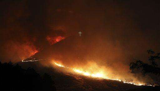 A wildfire burns near the Table Rock cross in Boise, Idaho in the early morning hours of Thursday, June 30, 2016. Strong winds pushed the fire around Table Rock and south toward Warm Springs Mesa subdivision and Harris Ranch, according to the Idaho Statesman. (Joe Jaszewski/Idaho Statesman via AP) The Associated Press