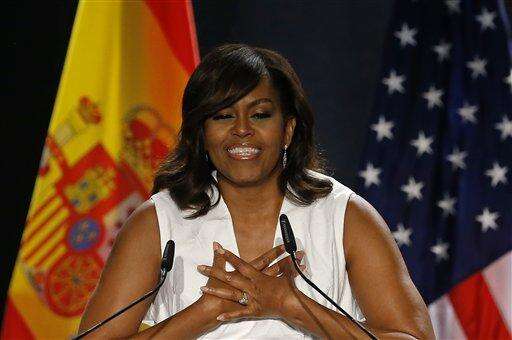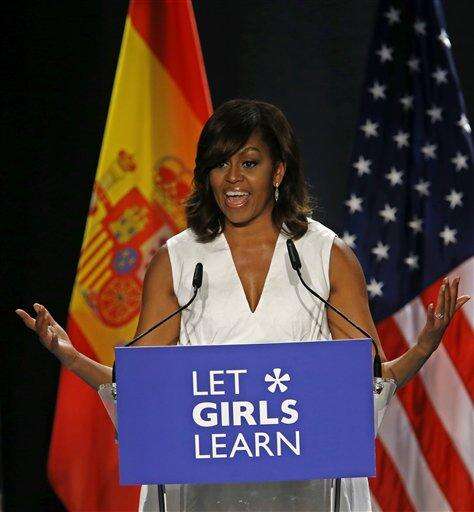 U.S. first lady Michelle Obama gives a speech on her "Let Girls Learn" initiative to a group of girls and young women in Madrid, Spain, Thursday June 30, 2016. President Barack Obama and the first lady launched the initiative last year to address the barriers that keep more than 62 million girls around the world out of school. (AP Photo/Francisco Seco) The Associated Press