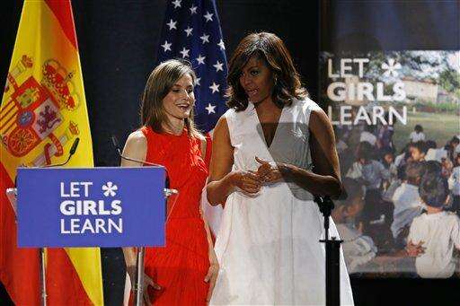 U.S. first lady Michelle Obama and Spain's Princess Letizia, left, talk during the "Let Girls Learn" initiative to a group of girls and young women in Madrid, Spain, Thursday June 30, 2016. President Barack Obama and the first lady launched the initiative last year to address the barriers that keep more than 62 million girls around the world out of school. (AP Photo/Francisco Seco) The Associated Press