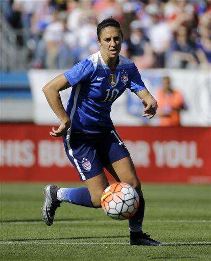 FILE - In this March 6, 2016, file photo, United States' midfielder Carli Lloyd plays against France during the first half of a SheBelieves Cup women's soccer match in Nashville, Tenn. Carli Lloyd says the time she's had to take to recover from a minor knee injury has been a blessing. It helped her slow down and reflect on a wild year. (AP Photo/Mark Humphrey, File) The Associated Press