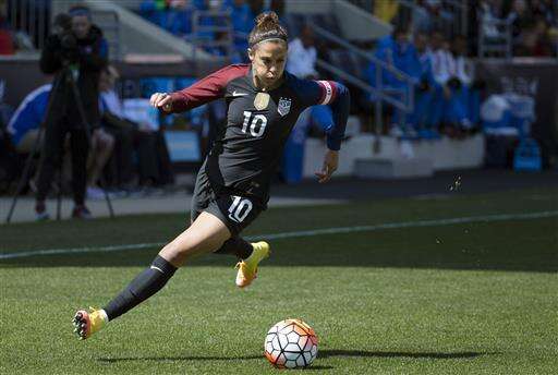FILE- In this April 10, 2016, file photo, United States' Carli Lloyd dribbles the ball during the first half of an international friendly soccer match against Colombia in Chester, Pa. Lloyd says her knee injury may have been a blessing in disguise because it forced her to take a step back from a crazy year. She vows she’s rested and ready for the Olympics in Brazil. (AP Photo/Chris Szagola, File) The Associated Press