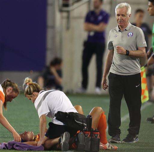 FILE- In this April 23, 2016, file photo, Orlando head coach Tom Sermanni, right, walks towards injured Houston Dash midfielder Carli Lloyd as she is tended to during a National Women's Soccer League match between the Dash and Orlando Pride at the Citrus Bowl in Orlando. Lloyd says her knee injury may have been a blessing in disguise because it forced her to take a step back from a crazy year. She vows she’s rested and ready for the Olympics in Brazil. (Stephen M. Dowell/Orlando Sentinel via AP, File) The Associated Press