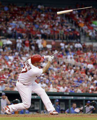St. Louis Cardinals' Jhonny Peralta breaks his bat while grounding out during the fourth inning of a baseball game against the Kansas City Royals on Thursday, June 30, 2016, in St. Louis. (AP Photo/Jeff Roberson) The Associated Press