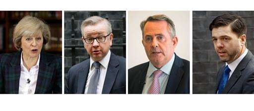 Four of the contenders to become the next leader of the British Conservative Party, in this combo photo issued Thursday June 30, 2016. With left to right: Theresa May taken June 30, 2016; Michael Gove taken May 11, 2016; Liam Fox taken June 30, 2016; Stephen Crabb taken March 22, 2016. The battle to succeed David Cameron as Conservative Party leader has drawn strong contenders with the winner set to become prime minister and play a vital role in shaping Britain's future relationship with the European Union. (AP Photo) The Associated Press