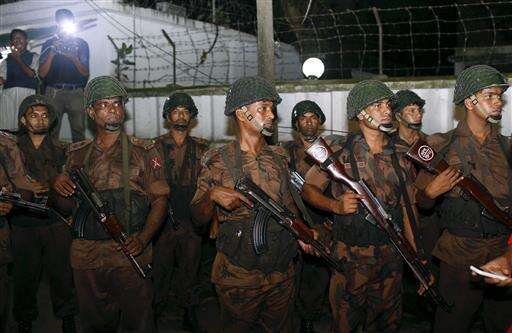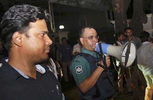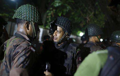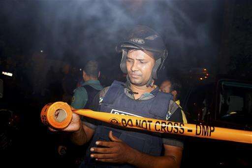 DHAKA, Bangladesh (AP) - Heavy gunfire and explosions rang out Saturday morning as Bangladesh security forces backed by armored vehicles moved to end a 10-hour standoff with heavily armed militants holding dozens of people hostage, including foreigners, after storming an upscale restaurant at the heart of Bangladesh's diplomatic zone. Two police officers were killed and at least 26 people wounded in an earlier gunbattle.