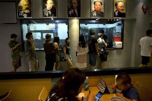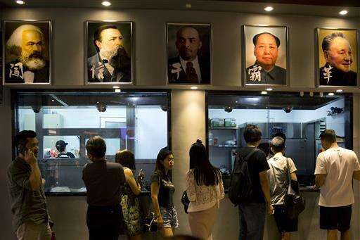 In this photo taken Saturday, June 25, 2016, customers at a restaurant wait for their orders under the portraits of former Communist leaders including Karl Marx, top left, and Mao Zedong, second from right at top, in Beijing, China. In a televised speech on the 95th anniversary of the party's formation on July 1, 2016, Chinese President Xi Jinping has urged the 88-million-strong Communist Party to embrace its Marxist roots as he delivered an emphatic call for ideological discipline and a vigorous defense of party rule.(AP Photo/Ng Han Guan) The Associated Press