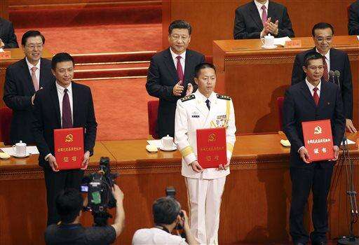 Chinese Communist party members receive honor certificates from President Xi Jinping, rear center, Premier Li Keqiang, rear right, and Chairman of the Standing Committee of the National People's Congress Zhang Dejiang, rear left, during a ceremony to mark the 95th anniversary of the founding of the Communist Party of China at the Great Hall of the People in Beijing, Friday, July 1, 2016. (How Hwee Young/Pool Photo via AP) The Associated Press