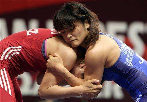 FILE - In this May 6, 2015, file photo, Japan's Kaori Icho, right, battles Kyrgyzstan's Aisuluu Tynybekova of Kyrgyzstan during the final of the 65 kilogram category at the Asian Championship of wrestling in Doha, Qatar. Japan’s Kaori Icho and Saori Yoshida have dominated the sport as thoroughly as any athletes in the world since then. (AP Photo/Osama Faisal, File) The Associated Press