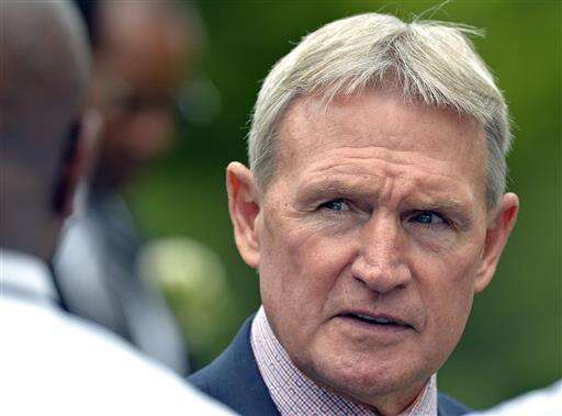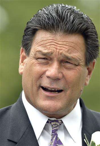 Pall bearer Dan Hampton speaks with reporters about his memories of Buddy Ryan outside the Ritchie & Peach Funeral Home, Friday, July 1, 2016 in Lawrenceburg Ky. (AP Photo/Timothy D. Easley) The Associated Press