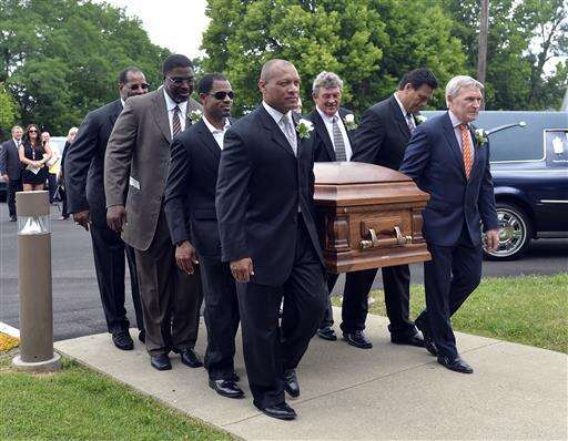 Pall bearers, from left, Richard Dent, Eric Allen, Aeneas Williams, Dan Neal, Dan Hampton and Doug Plank carry the coffin of Buddy Ryan into St. Lawrence Catholic Church for a funeral service, Friday, July 1, 2016 in Lawrenceburg Ky. (AP Photo/Timothy D. Easley) The Associated Press