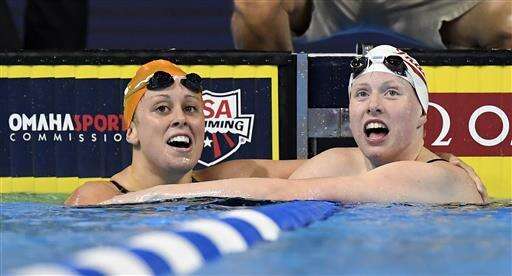 Lilly King, right, reacts with Molly Hannis, left, after winning the women's 200-meter breaststroke final at the U.S. Olympic swimming trials Friday, July 1, 2016, in Omaha, Neb. Hannis finished in second place. (AP Photo/Mark J. Terrill) The Associated Press