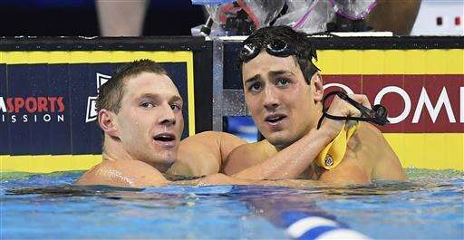 Ryan Murphy, left, reacts with Jacob Pebley, right, after winning the men's 200-meter backstroke final at the U.S. Olympic swimming trials, in Omaha, Neb., Friday, July 1, 2016. Pebley finished in second place. (AP Photo/Mark J. Terrill) The Associated Press
