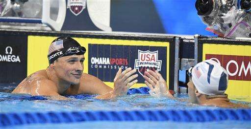 Ryan Lochte, left, reacts with Michael Phelps, right, after the men's 200-meter individual medley final at the U.S. Olympic swimming trials, Friday, July 1, 2016, in Omaha, Neb. Phelps won the race and Lochte finished in second place. (AP Photo/Mark J. Terrill) The Associated Press