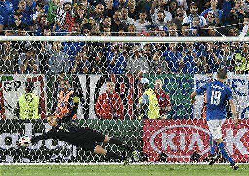Germany goalkeeper Manuel Neuer saves a penalty by Italy's Leonardo Bonucci during the Euro 2016 quarterfinal soccer match between Germany and Italy, at the Nouveau Stade in Bordeaux, France, Saturday, July 2, 2016. Germany beat Italy 6-5 in a penalty shootout. (AP Photo/Antonio Calanni) The Associated Press