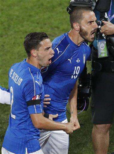 Italy's Leonardo Bonucci, right, celebrates with his teammate Mattia De Sciglio after scoring his side's first goal during the Euro 2016 quarterfinal soccer match between Germany and Italy, at the Nouveau Stade in Bordeaux, France, Saturday, July 2, 2016. (AP Photo/Michael Sohn) The Associated Press