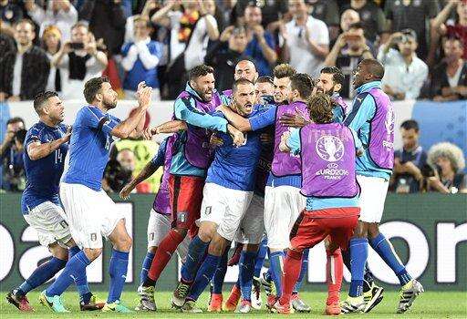 Italy's Leonardo Bonucci, left,, celebrates with his teammates after scoring his side's first goal during the Euro 2016 quarterfinal soccer match between Germany and Italy, at the Nouveau Stade in Bordeaux, France, Saturday, July 2, 2016. (AP Photo/Michael Sohn) The Associated Press