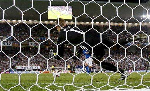 Germany goalkeeper Manuel Neuer stops a penalty from Italy's Leonardo Bonucci during a shoot out at the end of the Euro 2016 quarterfinal soccer match between Germany and Italy, at the Nouveau Stade in Bordeaux, France, Saturday, July 2, 2016. Germany defeated Italy 6-5 in a penalty shootout after the game ended tied 1-1. (AP Photo/Martin Meissner) The Associated Press