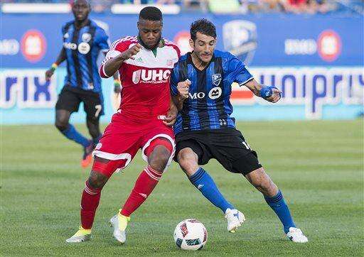 New England Revolution's Andrew Farrell, left, challenges Montreal Impact's Ignacio Piatti during the second half of an MLS soccer game in Montreal on Saturday, July 2, 2016. (Graham Hughes/The Canadian Press via AP)