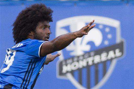 Montreal Impact's Michael Salazar celebrates after scoring against the New England Revolution during the second half of an MLS soccer match in Montreal on Saturday, July 2, 2016. (Graham Hughes/The Canadian Press via AP)