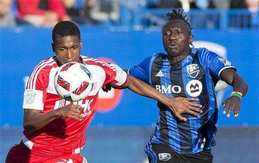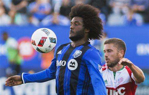 New England Revolution's London Woodberry, left, keeps his eyes on the ball as Montreal Impact's Dominic Oduro defends during the second half of an MLS soccer game in Montreal on Saturday, July 2, 2016. (Graham Hughes/The Canadian Press via AP)