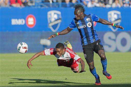 New England Revolution's London Woodberry, left, goes down after a challenge by Montreal Impact's Dominic Oduro during the second half of an MLS soccer game in Montreal on Saturday, July 2, 2016. (Graham Hughes/The Canadian Press via AP)