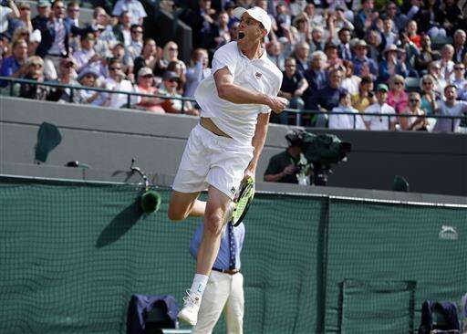 Sam Querrey of the U.S celebrates after beating Novak Djokovic of Serbia in their men's singles match on day six of the Wimbledon Tennis Championships in London, Saturday, July 2, 2016. (AP Photo/Alastair Grant) The Associated Press