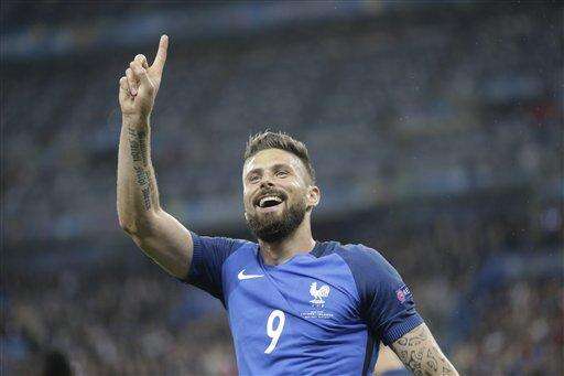 France's Olivier Giroud celebrates after scoring his side's fifth goal during the Euro 2016 quarterfinal soccer match between France and Iceland, at the Stade de France in Saint-Denis, north of Paris, France, Sunday, July 3, 2016. (AP Photo/Petr David Josek) The Associated Press