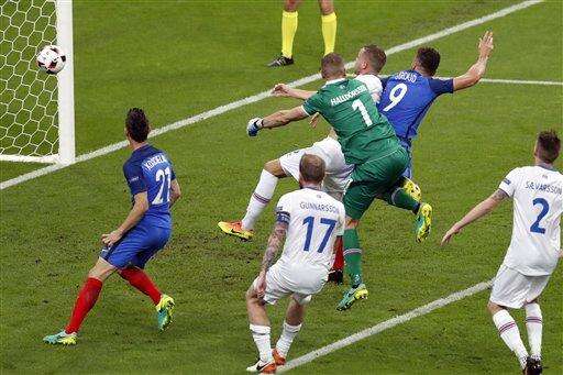 France's Olivier Giroud, top right, scores his sides' fifth goal during the Euro 2016 quarterfinal soccer match between France and Iceland, at the Stade de France in Saint-Denis, north of Paris, France, Sunday, July 3, 2016. (AP Photo/Michael Sohn) The Associated Press