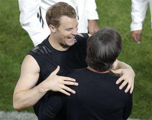 Germany goalkeeper Manuel Neuer hugs with Germany coach Joachim Loew at the end of the Euro 2016 quarterfinal soccer match between Germany and Italy, at the Nouveau Stade in Bordeaux, France, Saturday, July 2, 2016. Germany beat Italy 6-5 in a penalty shootout. (AP Photo/Michael Sohn) The Associated Press