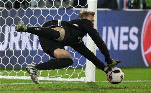 Germany goalkeeper Manuel Neuer makes a safe during the Euro 2016 quarterfinal soccer match between Germany and Italy, at the Nouveau Stade in Bordeaux, France, Saturday, July 2, 2016. (AP Photo/Thanassis Stavrakis) The Associated Press