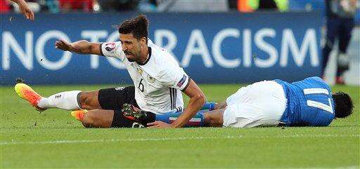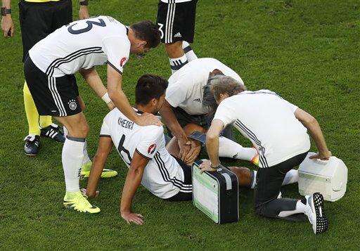 Germany's Sami Khedira gets assistance after getting injured during the Euro 2016 quarterfinal soccer match between Germany and Italy, at the Nouveau Stade in Bordeaux, France, Saturday, July 2, 2016. (AP Photo/Michael Sohn) The Associated Press