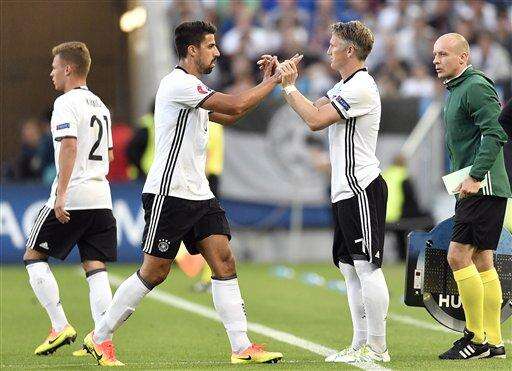 Germany's Bastian Schweinsteiger, center right, replaces teammate Sami Khedira on the pitch during the Euro 2016 quarterfinal soccer match between Germany and Italy, at the Nouveau Stade in Bordeaux, France, Saturday, July 2, 2016. (AP Photo/Martin Meissner) The Associated Press
