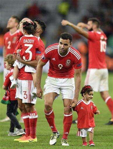 Wales' Hal Robson Kanu plays with a child on the pitch at the end of the Euro 2016 quarterfinal soccer match between Wales and Belgium, at the Pierre Mauroy stadium in Villeneuve d’Ascq, near Lille, France, Friday, July 1, 2016. Wales won 3-1. (AP Photo/Martin Meissner) The Associated Press