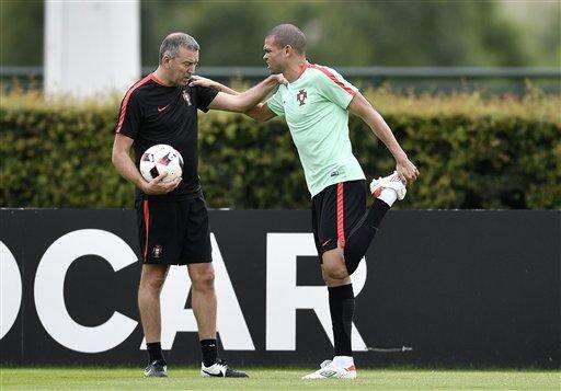 Portugal's Pepe stretches in Marcoussis, near Paris, France, Tuesday, July 5, 2016. Portugal will face Wales in a Euro 2016 semifinal soccer match in Lyon on Wednesday, July 6, 2016. (AP Photo/Martin Meissner) The Associated Press