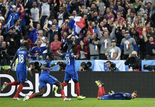 France's Antoine Griezmann, on the ground, celebrates after scoring his side’s fourth goal during the Euro 2016 quarterfinal soccer match between France and Iceland, at the Stade de France in Saint-Denis, north of Paris, France, Sunday, July 3, 2016. (AP Photo/Martin Meissner) The Associated Press