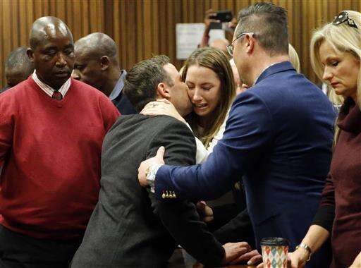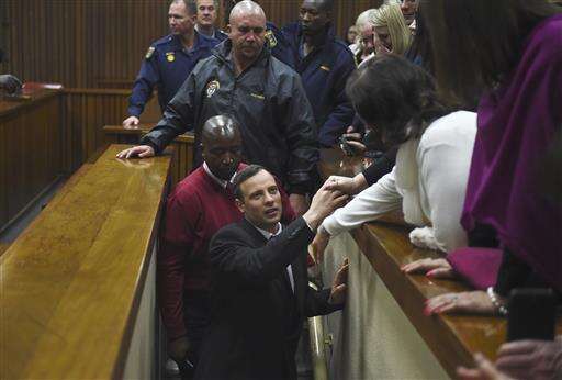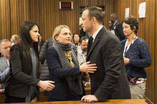 Pistorius, who shot Steenkamp through the door of a toilet cubicle in his home in 2013, was asked to stand and face Masipa as she announced his sentence in a wood-paneled courtroom in the South African capital, Pretoria. He was calm after the ruling, embracing his aunt and tearful sister before being led down a courtroom staircase to a holding cell ahead of being taken to prison.
