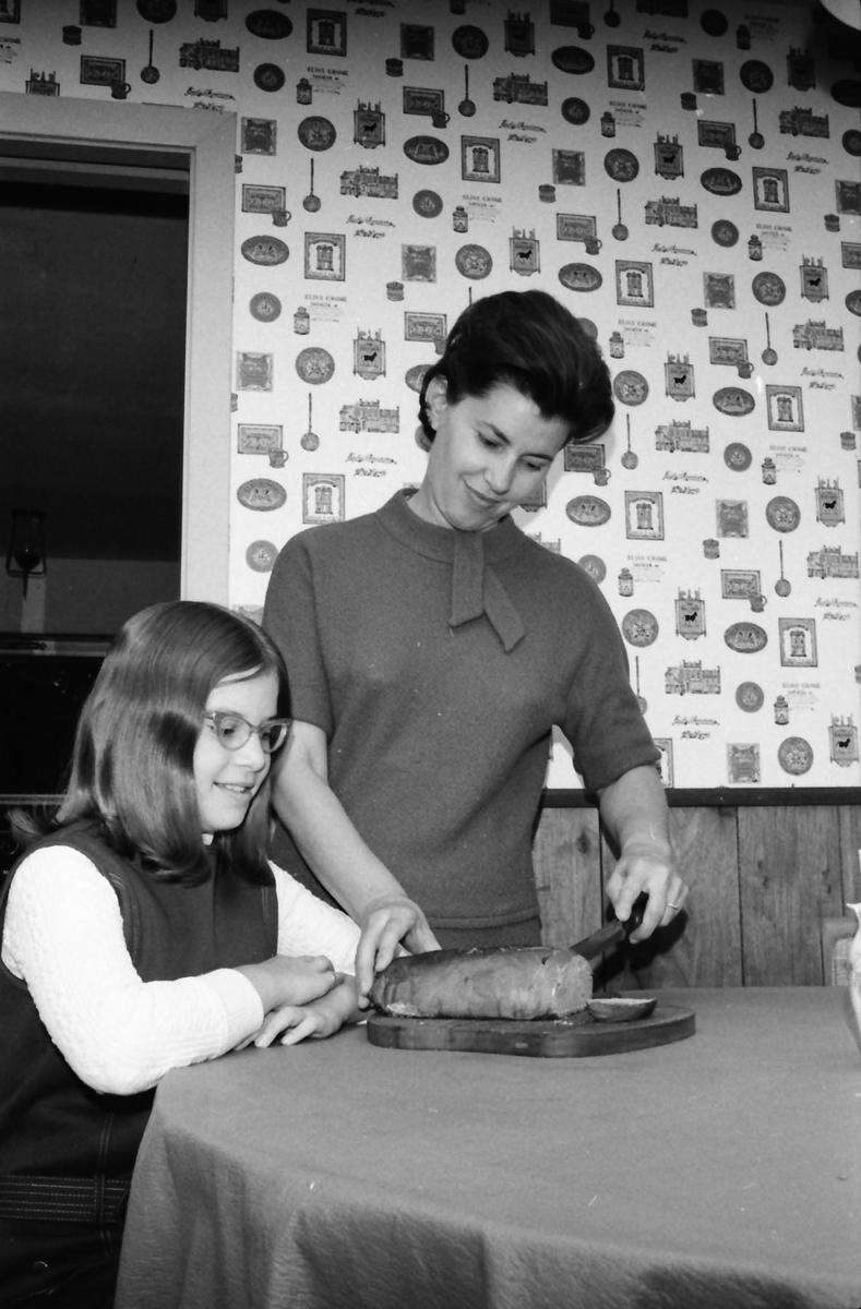 Fresh bread is on the table and busy paper is on the wall in this September 1969 Cook of the Week photograph in Mount Prospect. The cook is identified as Mrs. Jackson and the young girl with the cat-eye glasses is probably her daughter.