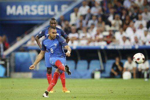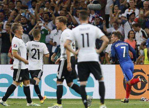 Antoine Griezmann converted a penalty in stoppage time after Germany captain Bastian Schweinsteiger handled the ball in the area as he challenged Patrice Evra. Griezmann fired his spot-kick into the bottom left corner to give France a 1-0 lead at halftime in their semifinal.