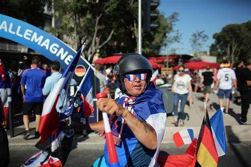 On a beach near the city's Fan Zone, German fans lived up to one national stereotype by laying out their flags alongside towels early in the day as they soaked up the Mediterranean sun hours before their team attempted to reach Sunday's final. Portugal awaits the winner, with Germany hoping to add the European title to the World Cup it won two years ago in Brazil.