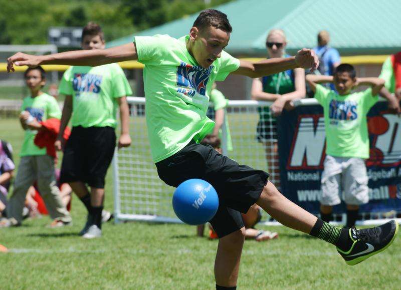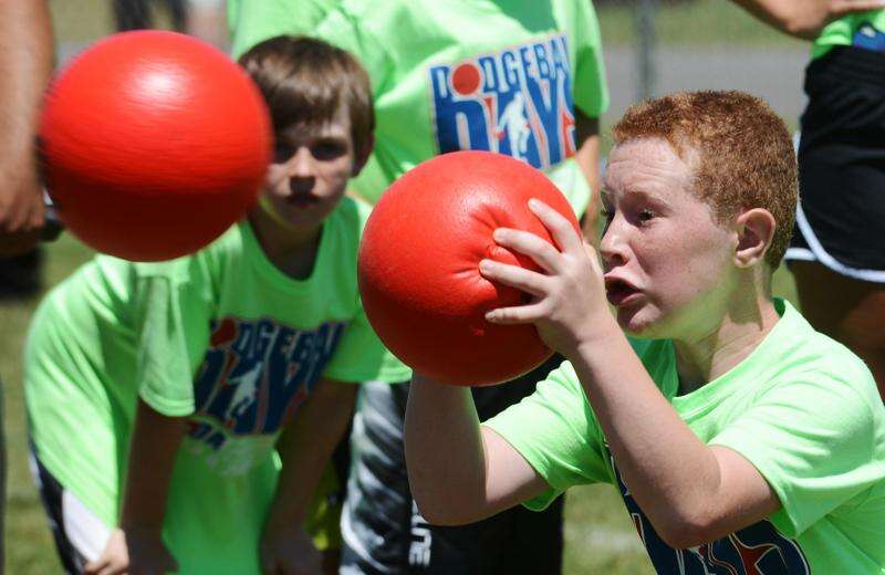Tyler Nardone, 13, a Hoffman Estates teen camper, tries to get out of the way of an opponent's throw during Friday's youth dodgeball tournament at Olympic Park in Schaumburg.