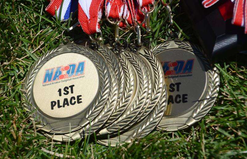 First-place medals are ready to be distributed at Friday's youth dodgeball tournament at Olympic Park in Schaumburg.