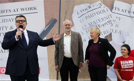 FILE- In this file photo dated Tuesday, June 7, 2016, leader of Britain's Labour Party Jeremy Corbyn, center, party deputy leader Tom Watson MP, left, and Angela Eagle MP, Shadow First Secretary of State and Shadow Secretary of State for Business, Innovation and Skills, during a referendum event in London. Corbyn will face a leadership contest on upcoming Monday, from Angela Eagle, according to an announcement Saturday July 9, 2016. (AP Photo/Frank Augstein, FILE) The Associated Press