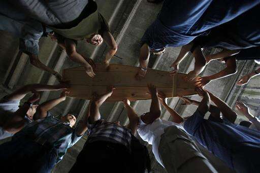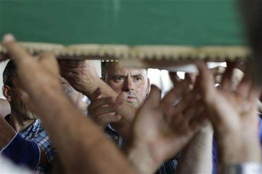 Bosnian Muslim people carry one of 127 coffins with identified victims of the Srebrenica massacre inside a memorial centre of Potocari near Srebrenica, 150 kms north east of Sarajevo, Bosnia, Saturday, July 9, 2016, prior to their burial scheduled for Monday. Thousands of Bosnians raised their hands in prayer Saturday as a truck bearing 127 coffins passed through the capital on its way to Srebrenica, where the newly identified victims of Europe's worst massacre since World War II will be buried on the 21th anniversary of the crime. (AP Photo/Amel Emric)